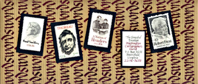 the theme in 2002 was *The Written Word* - so carol wrote the word *words* a gazillion times. you could adopt this idea for an envelope by writing the person's name over and over and then applying stamps and a mailing label.